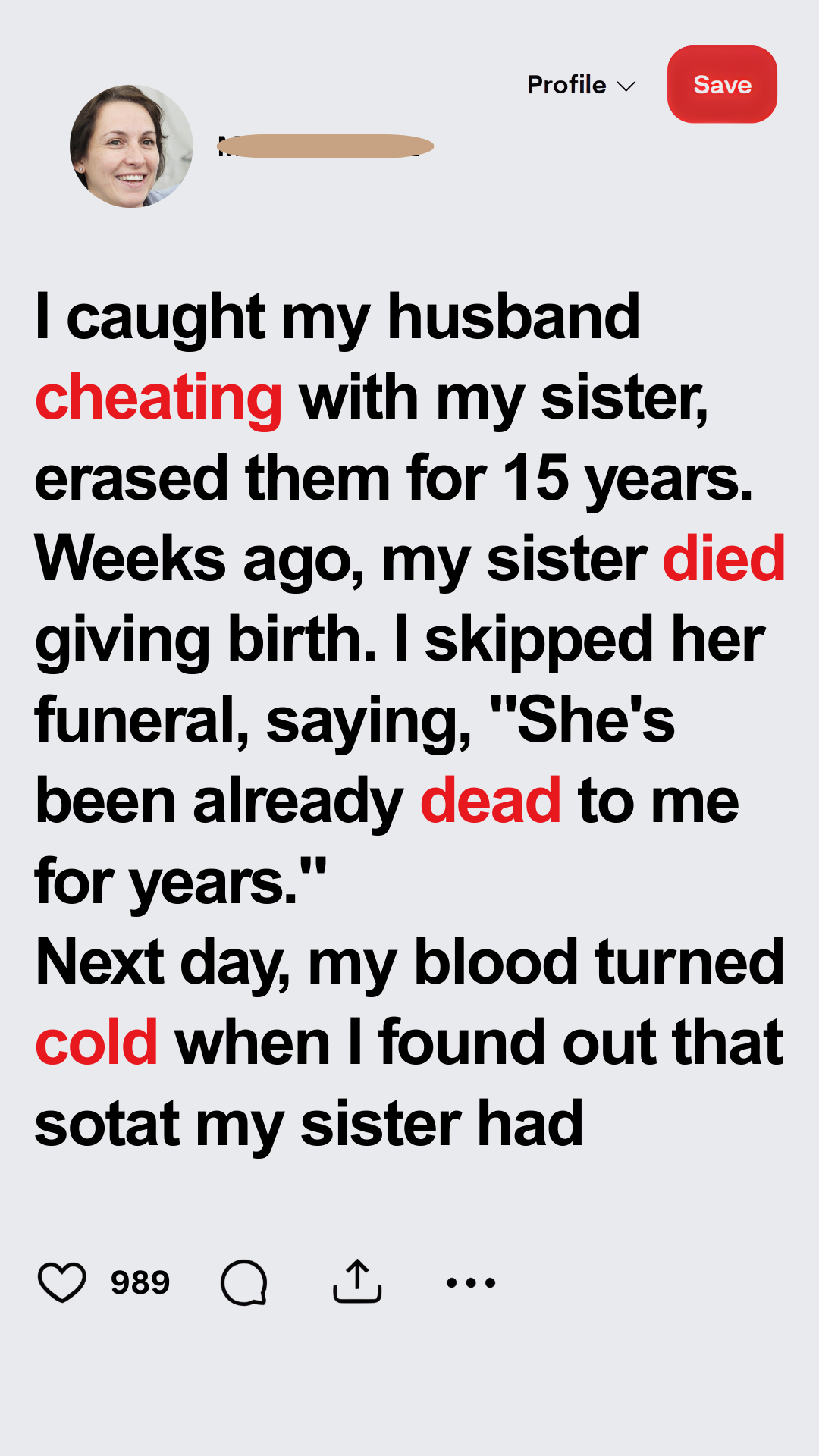 “She’s gone,” she said. “Your sister. She died giving birth.”