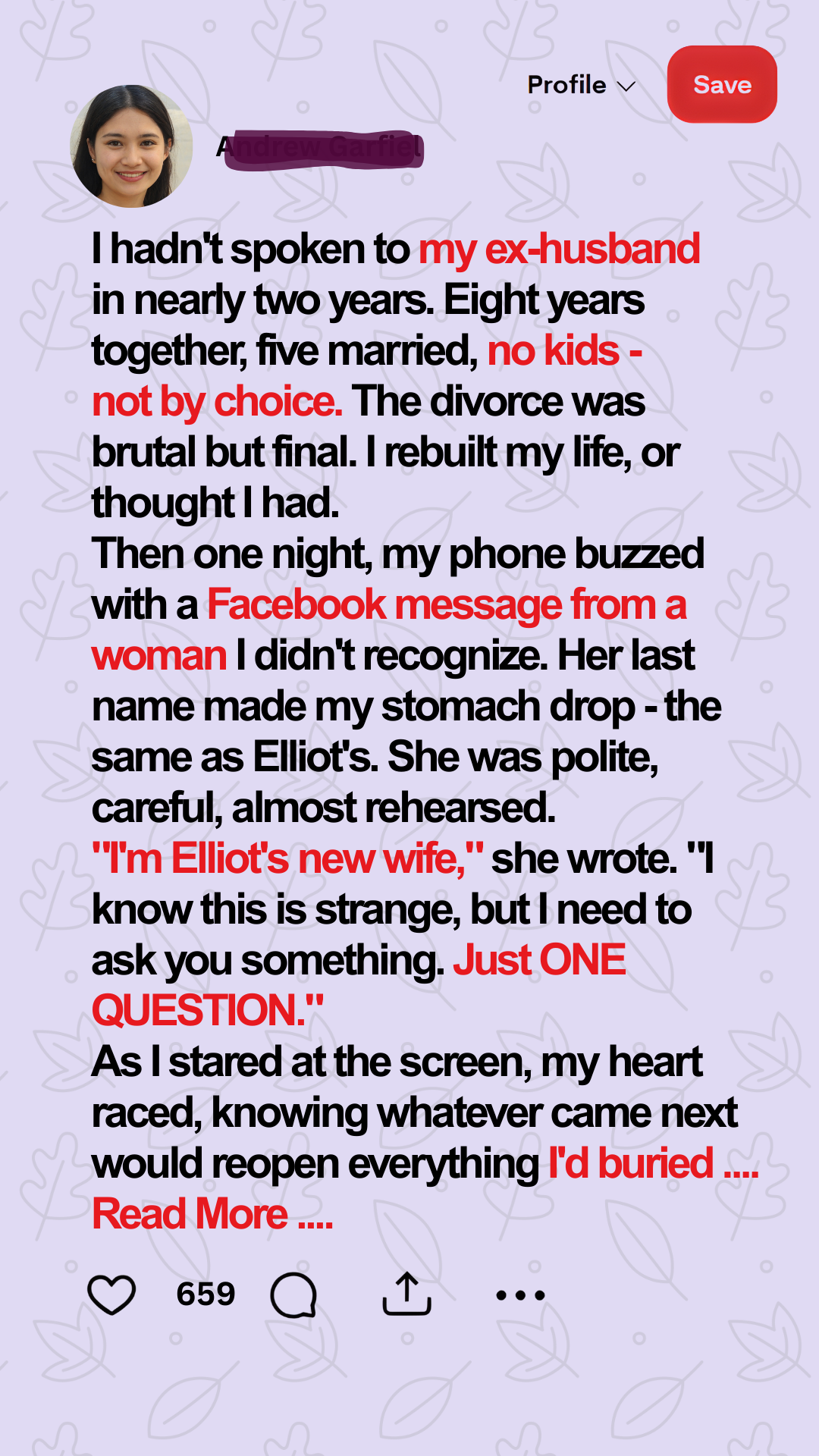 “Hi. I’m sorry to bother you. I’m Elliot’s new wife. I know this is strange, but I need to ask you something. Elliot asked me to reach out. He said it would sound better coming from me. I didn’t want to, but… I’ve been feeling weird about how he’s acting. It’s just one question. Can I?”