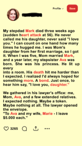 When Mark passed, the will was read. I braced myself for nothing. Instead, I got everything—his $640K estate. My mom and Ava got $5K each. I was stunned. But what came next shocked me more.