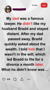 “In that moment, I knew my father had outsmarted Bradd in the best way possible,” she said. “He could finally rest in peace, knowing I was free of that lazy, spoiled kid.”