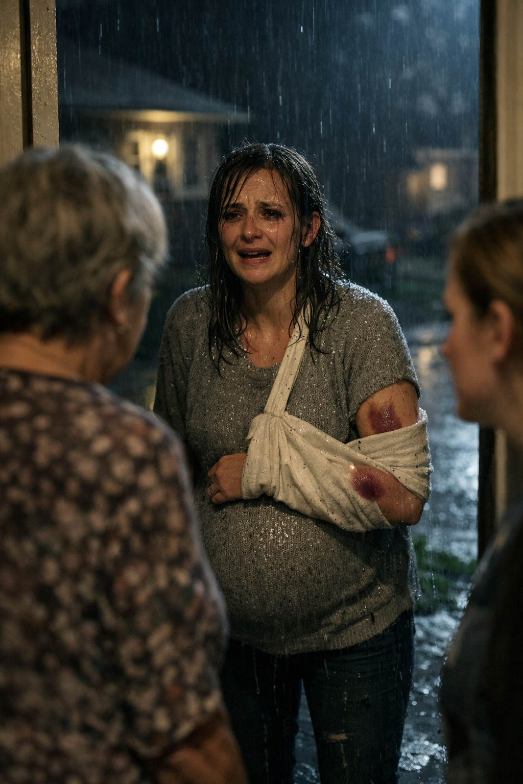 On the doorstep stood my neighbor from two houses down. She was eight months pregnant—her belly unmistakable beneath a thin, soaked sweater. Her hair clung to her face, her eyes swollen and red from crying. One arm hung uselessly at her side, wrapped in a makeshift sling, already bruising purple.