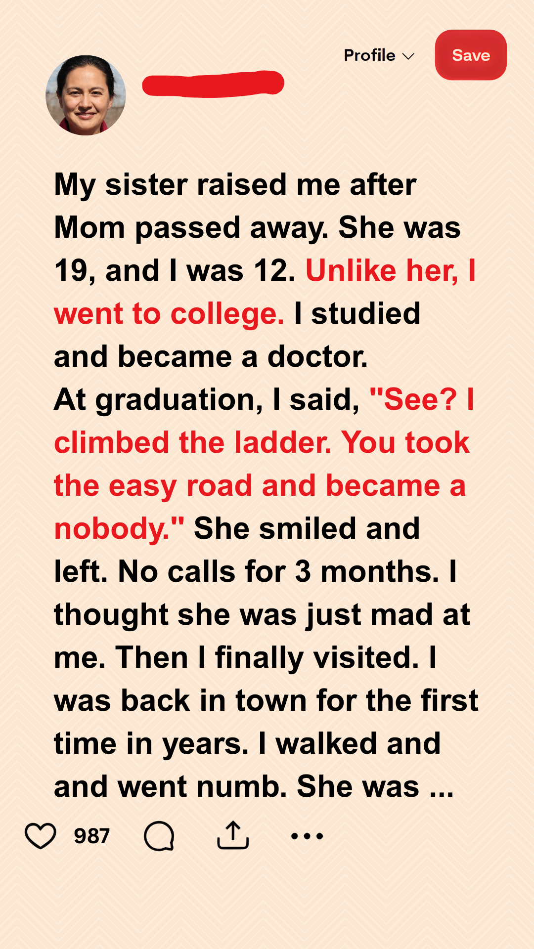 My sister raised me after Mom passed away.
